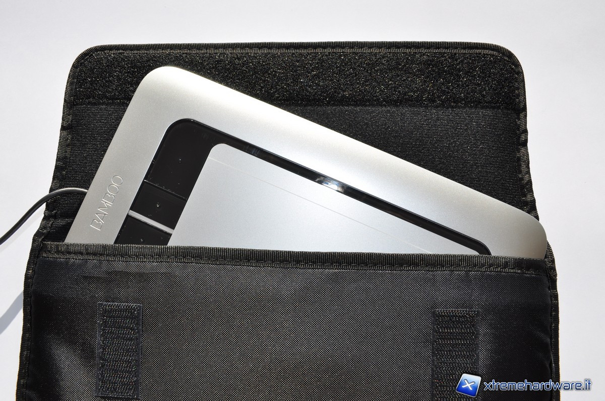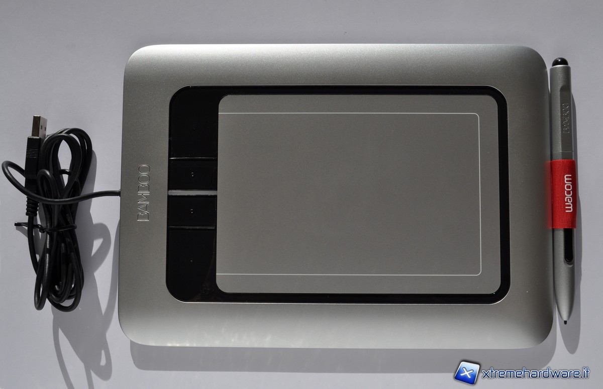 Prendendo in mano questa tavoletta grafica si rimane subito colpiti dalla sua leggerezza e dalla qualità dei materiali plastici adoperati. L’area dedicata all’interazione con la penna è leggermente ruvida e rievoca la sensazione tattile di quando si disegna sulla carta. La scocca esterna e i tasti sono invece perfettamente lisci. Nella parte posteriore sono presenti quattro gommini che garantiscono un’aderenza ottimale su qualsiasi superficie. Da uno dei due lati corti del prodotto spunta fuori il cavo USB, mentre sull’altro è presente un pratico portapenna in nylon rosso ostentante il logo Wacom.