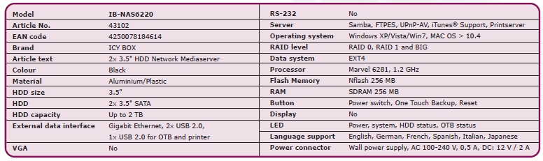 Raidsonic Icy Box IB-NAS6220, 2x3.5 NAS e Network Media Server - Caratteristiche tecniche & features